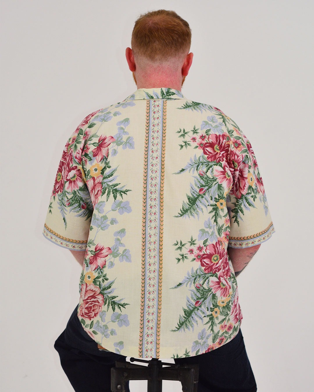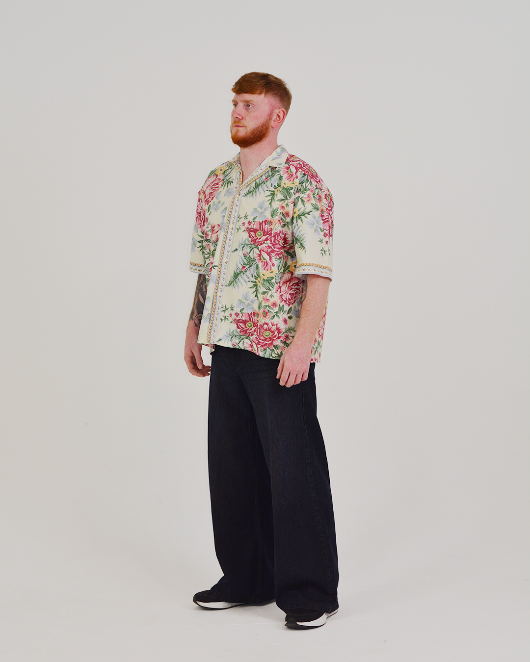 This shirt is made from 100% cotton fabric with a bold digital printed floral design set against a refined off-white base. This print design creates a striking contrast that feels both expressive and elevated. The running border details frame the print adding a depth to the overall composition.