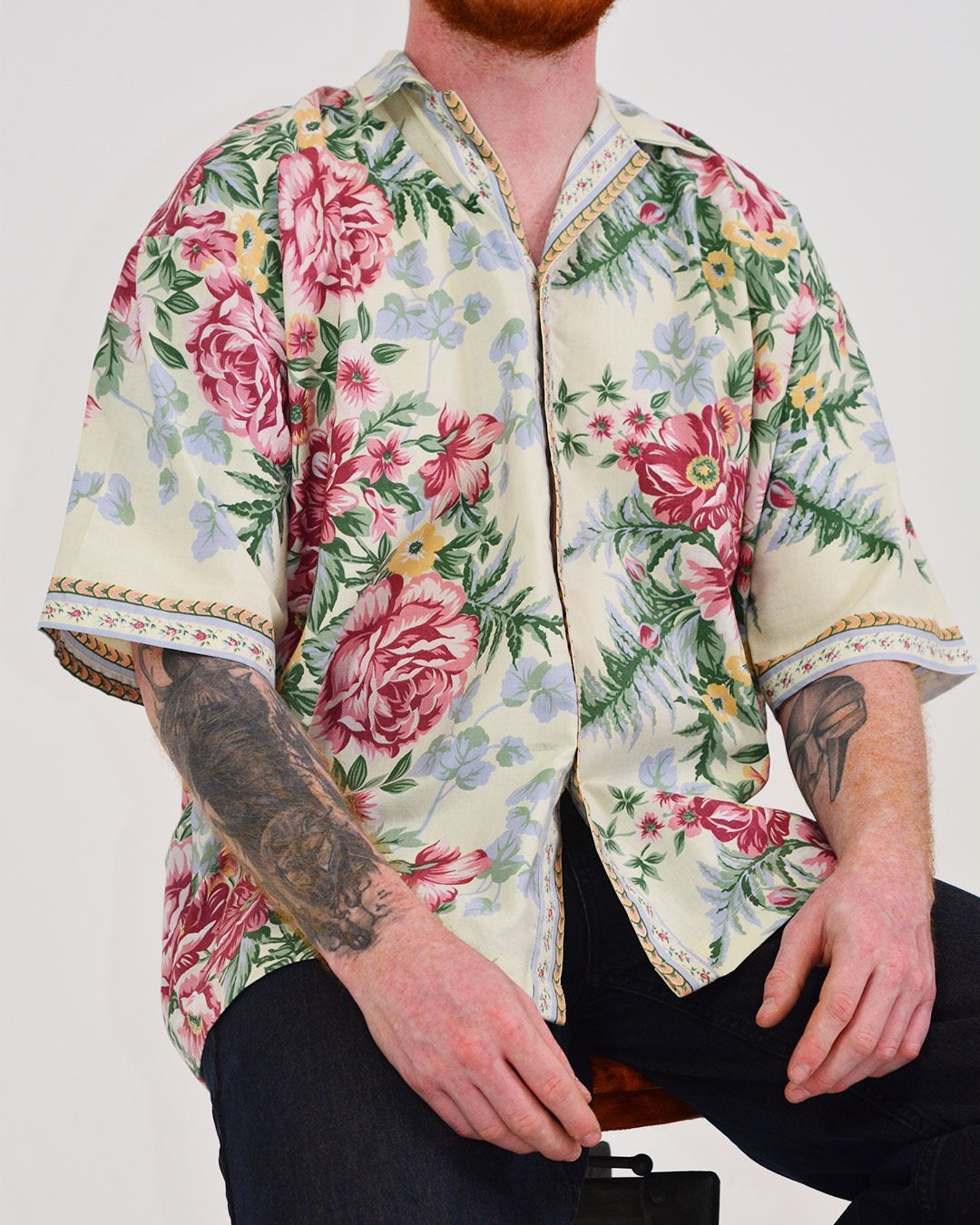 A boxy silhouette that brings a contemporary edge, grounding the floral print in confident masculinity. Designed for those who move with intention and dress with individuality, this shirt celebrates the balance between art and design. Each piece is expertly tailored to achieve a relaxed yet structured drape, ensuring it looks as considered as it feels.